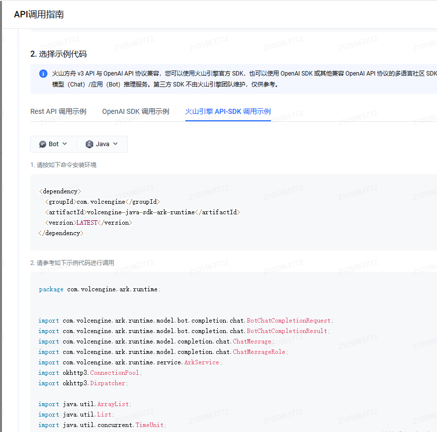 相关的apiKey、base-url、botId都可以从火山的API调用指南获取,获取完我们配置在application.yml里就可以从上面的代码获取