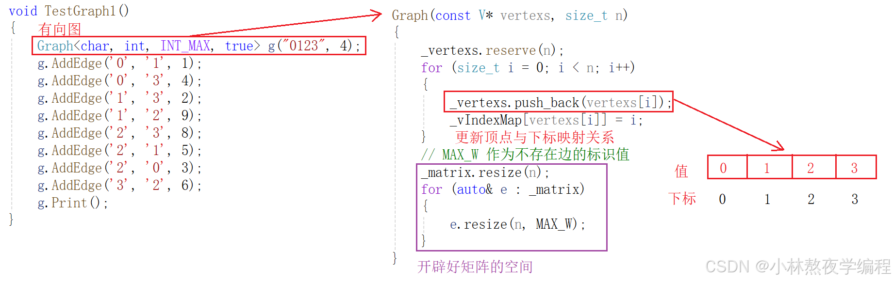 1、为了图的灵活性,此处使用模板来描述图,使用类型模板参数描述顶点和边的类型,使用非类型模板参数描述无穷大和图的方向。