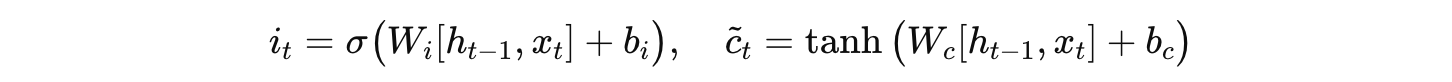 由输入门决定是否更新:在 LSTM 中,还有一个输入门(Input Gate),其计算公式为: