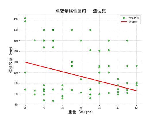 3)单变量线性回归测试集和训练集回归线,其中模型的拟合效果不算特别理想,数据点的离散程度较大,表明单变量回归无法很好地描述数据的复杂性。