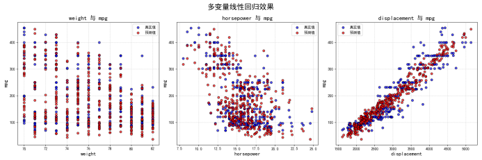 2)汽车属性与燃油效率关系,数据点越密集代表与燃油效率之间的相关性越高。,相较于单变量模型在性能上提升了 76.38%,性能提升显示了多变量回归在处理复杂数据关系时的优势。