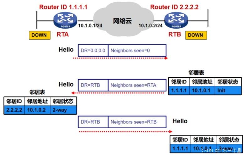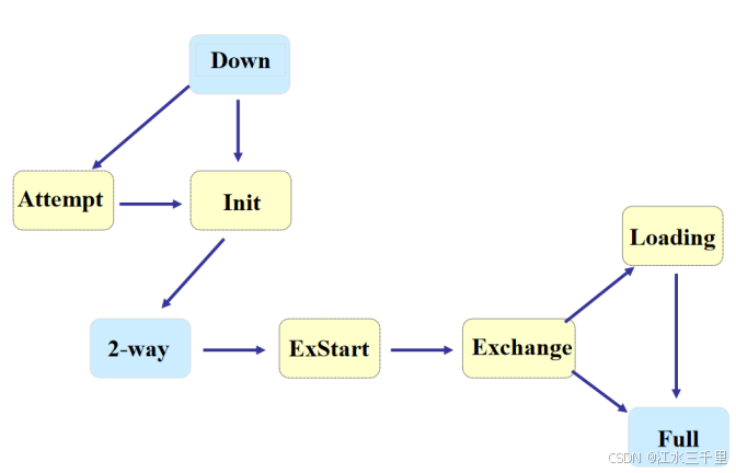| Down | 关闭状态(稳定状态),这种情况处于手动指定邻居的情况下,发送hello包之后进入下一个状态 |