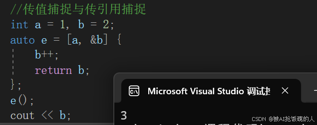 cpp//传值捕捉与传引用捕捉 int a = 1, b = 2; auto e = [a, &b] { b++; return b; };这里的a在lambda中无法修改,b在lambda中可以修改,且由于是引用,所以实参b也被修改了