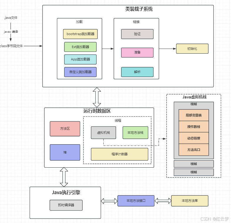 ② 虚拟机栈:存储方法调用的栈帧,包含局部变量表、操作数栈、动态链接、方法返回地址等