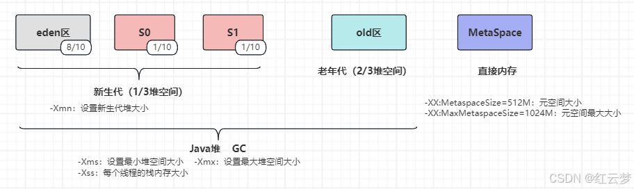② 方法区:存储类元信息(如类名、字段、方法)、运行时常量池、静态变量、即时编译后的代码等(JDK 8及之后:元空间(MetaSpace),使用本地内存)