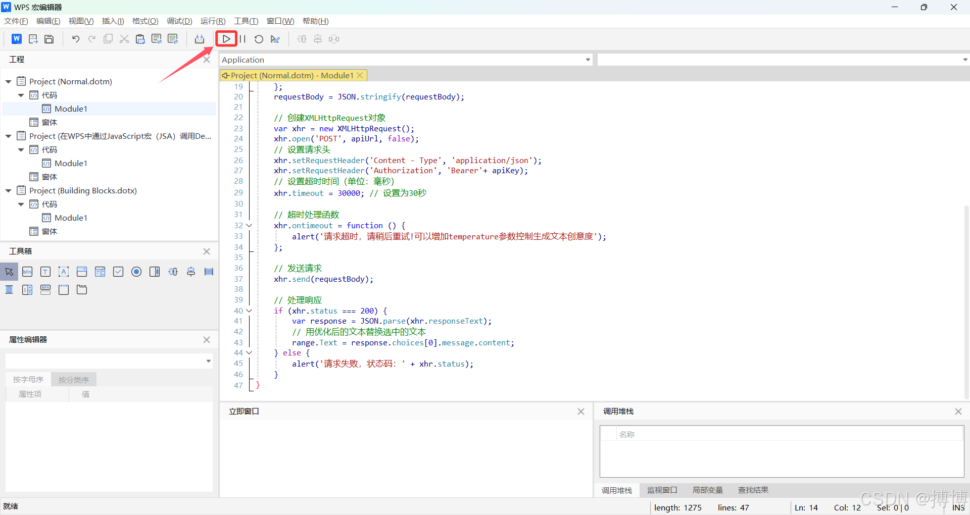 这个方式在我的另外一篇文章中已经讲解过了,具体的可以参照CSDN文章:在WPS中通过JavaScript宏(JSA)调用本地DeepSeek API优化文档教程:在WPS中通过JavaScript宏(JSA)调用本地DeepSeek API优化文档教程_wps调用api-CSDN博客。