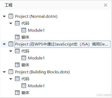 进入"WPS宏编辑器"之后,我们将在左上角的"工程"窗口中,看到Project(Normal.dotm)、Project(<当前打开的word文档名称>.docx) 和 Project(Building Blocks.dotx),我们应该在哪里添加模块,则需要先弄清楚WPS宏编辑器中三个工程的区别。