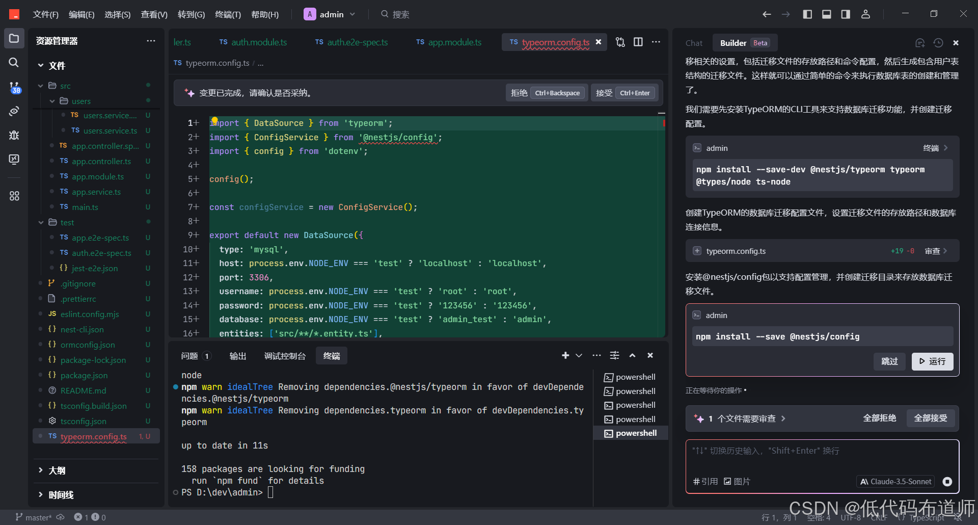 然后要求ai按照测试环境、正式环境分别给出配置,他先创建了不同环境的数据库配置文件