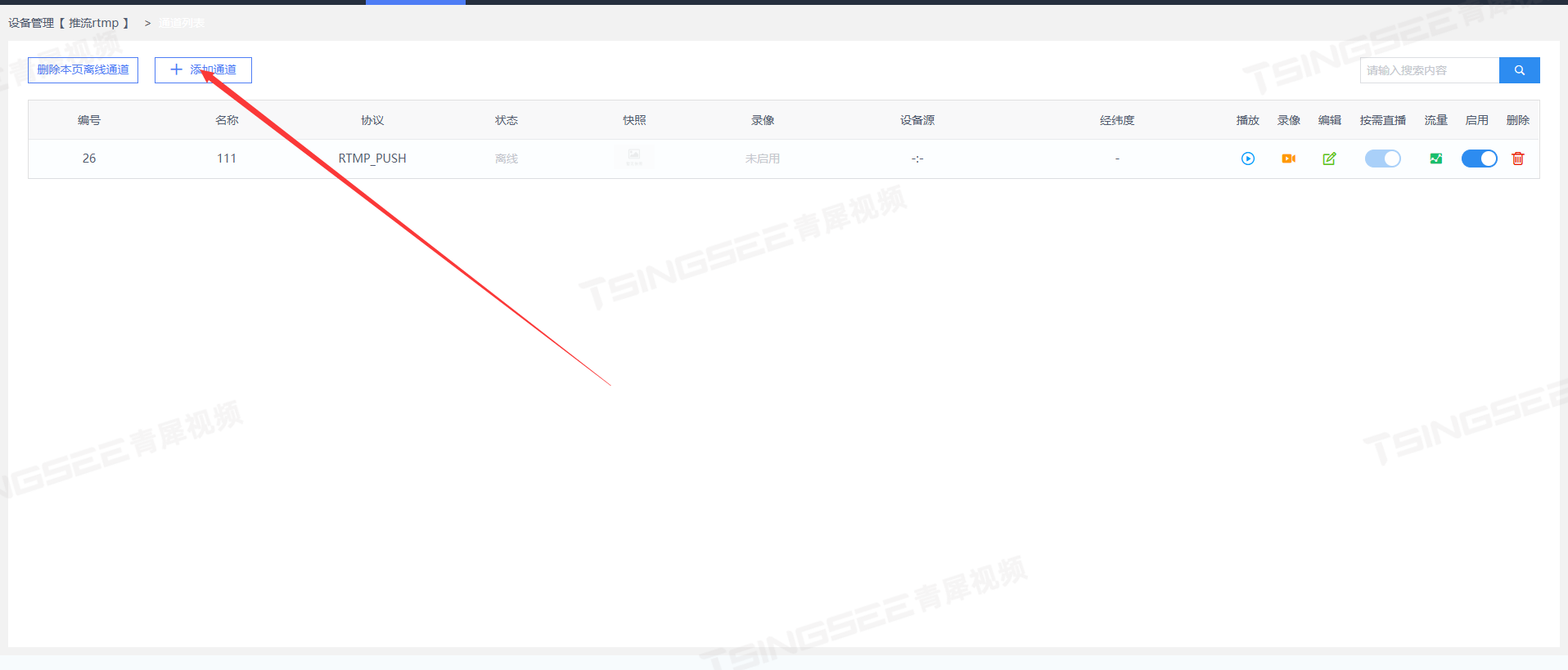 2)创建RTMP设备后,平台页面上方会提示新增通道,添加通道成功后进入该设备的通道列表,复制推流地址;