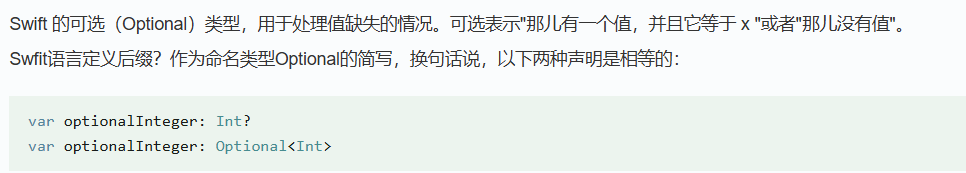在这两种情况下,变量 optionalInteger 都是可选整数类型。注意,在类型和 ?之间没有空格。