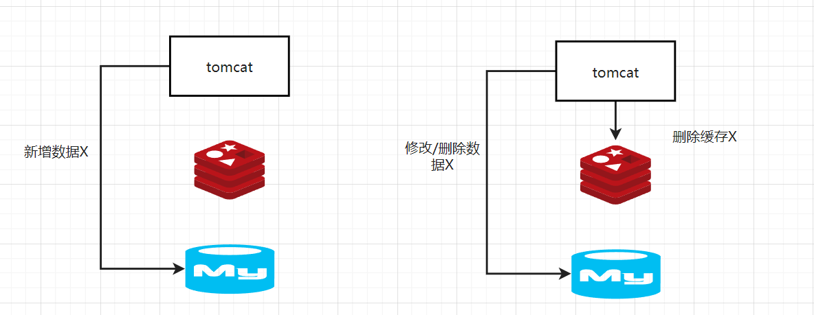 新增数据时,数据直接写到数据库中,不需要对缓存做任何的操作,此时,缓存中本身就没有新增数据,而数据库中的值就是最新值,此时缓存&数据库中的数据是一致的。