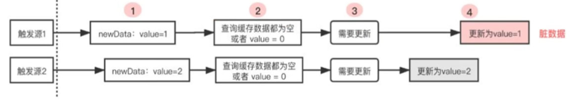举个例子:假设同一秒内同一条数据出现了两次更新,value=1和value=2,期望最终缓存中的数据是value=2。若这两次更新后的数据被先后触发,分两种情况: