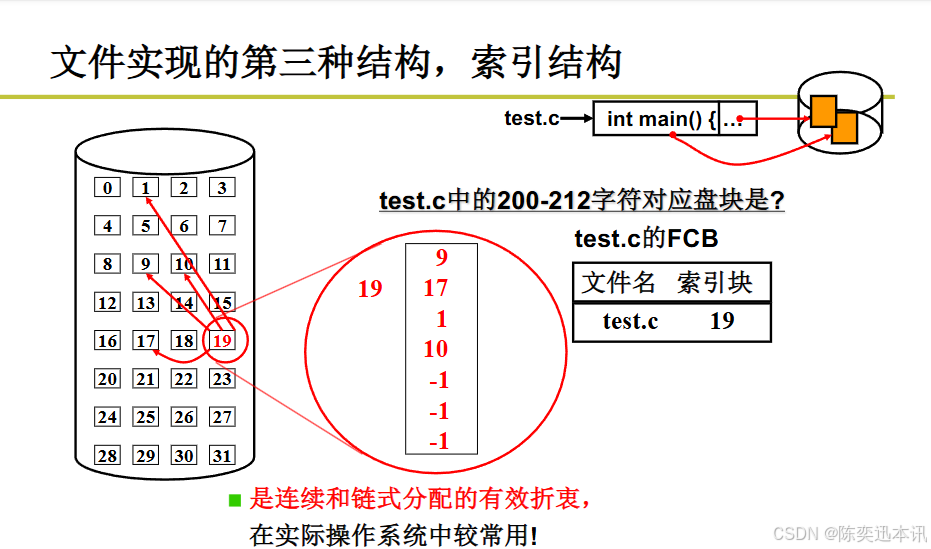 这种方式允许文件块在磁盘上非连续存储,同时避免了链式结构中的指针跟踪开销。