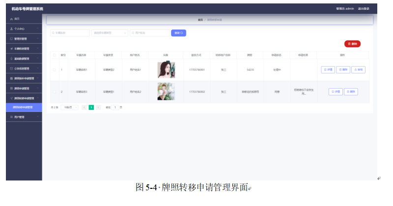 管理员进入如图5-4所示的牌照转移申请管理界面之后,管理员点击信息显示栏中最右侧的详情,删除按钮可依次完成牌照转移申请信息的详情查看,删除操作,对于未处理的牌照转移申请信息,管理员需要审核。