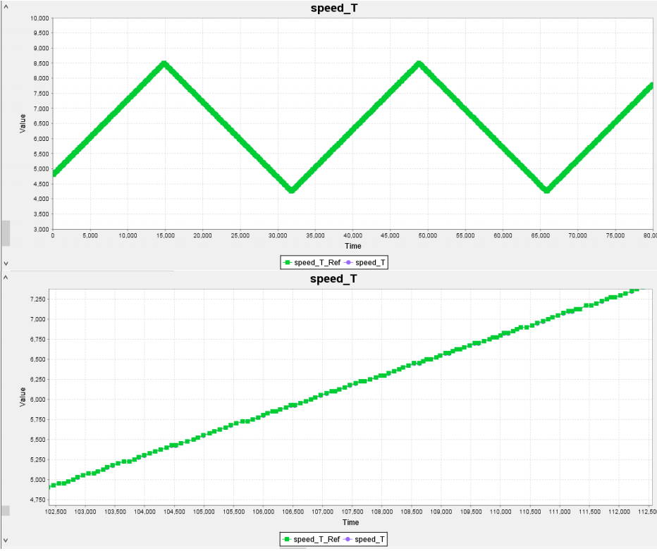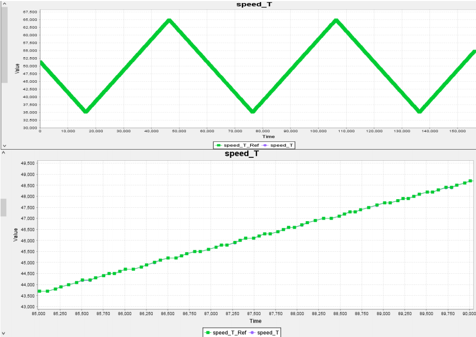 行模拟测试,结果如下,图中 Speed_M_Ref 和 Speed_T_Ref 为速度参考值,Speed_M 和