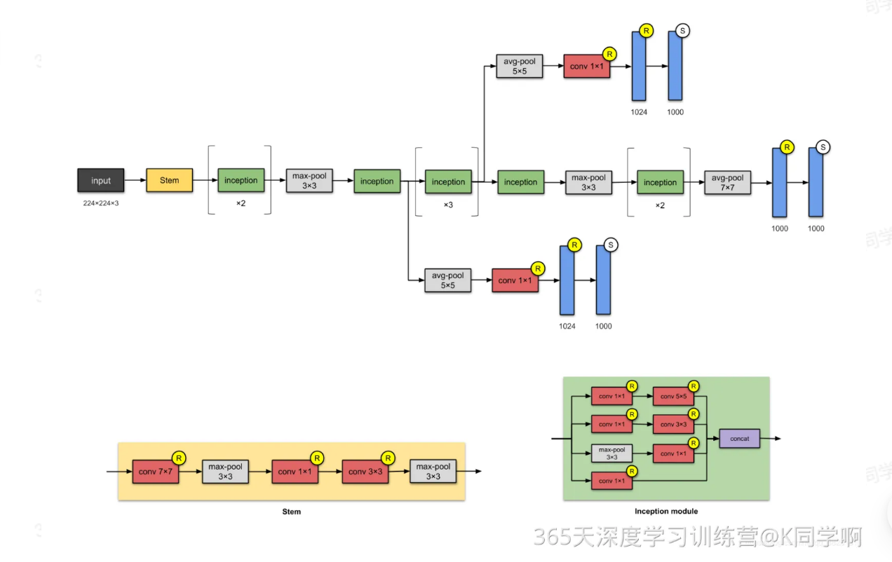 黄色是头部,主要用于数据处理的,绿色是上面介绍的Inception Module结构。