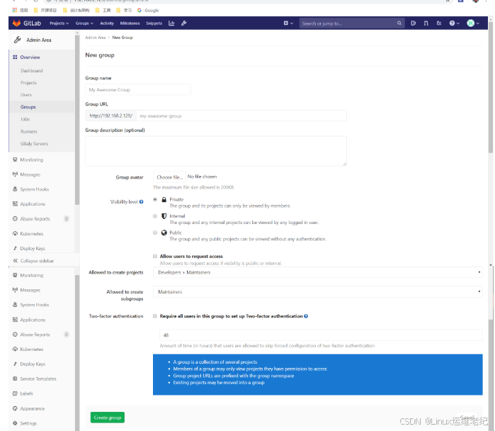Allowd to create projects:是否允许创建工程对于用户权限引入了角色进行管理,比如guester,Developers,Maintainers等等。 -