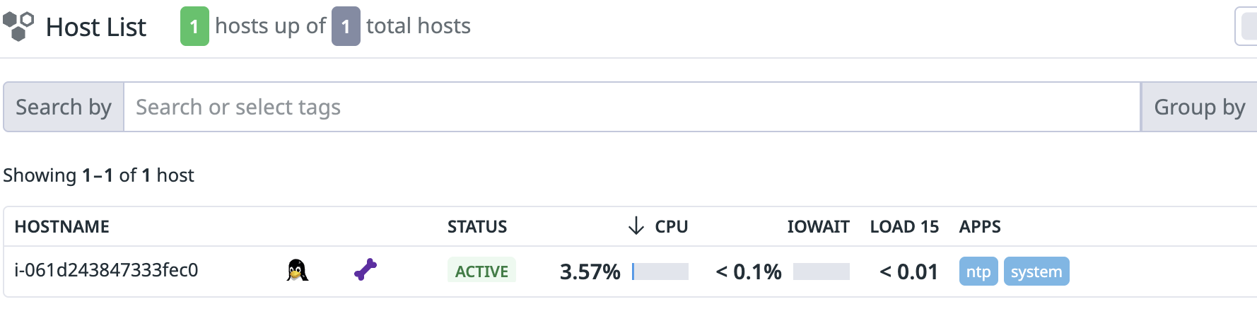 要验证安装是否成功,请转到 Datadog 门户并搜索"host"。如果您正确遵循安装步骤,您将在 Datadog 的host视图中看到AWS EC2。