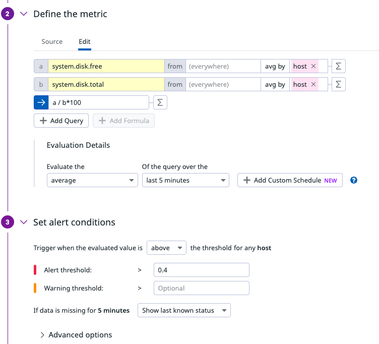 - 在"定义指标"部分,使用"system.disk.free"作为指标,并选择"平均值"作为主机。这是查询 a。
