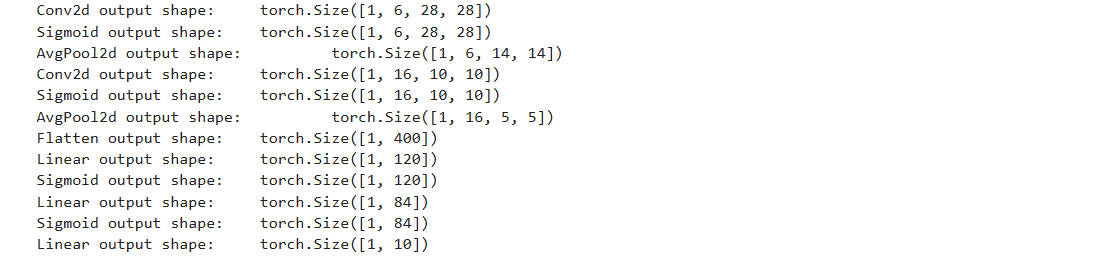 # 打印该层的类型(Conv2d、AvgPool2d、Flatten、Linear)以及输出张量的形状