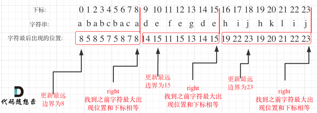 - 从头遍历字符,并更新字符的最远出现下标,如果找到字符最远出现位置下标和当前下标相等了,则找到了分割点,如图