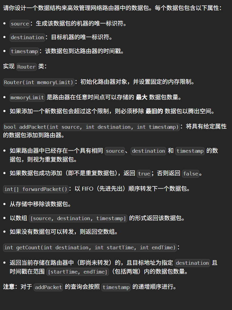 - b o o l a d d P a c k e t ( i n t s o u r c e , i n t d e s t i n a t i o n , i n t t i m e s t a m p ) bool\ \ addPacket(int\ \ source, int\ \ destination, int\ \ timestamp) bool addPacket(int source,int destination,int timestamp) 要求不能重复插入相同的数据包:需要一个哈希表 u n o r d e r e d _ s e t unordered\_set unordered_set,记录插入过的数据包