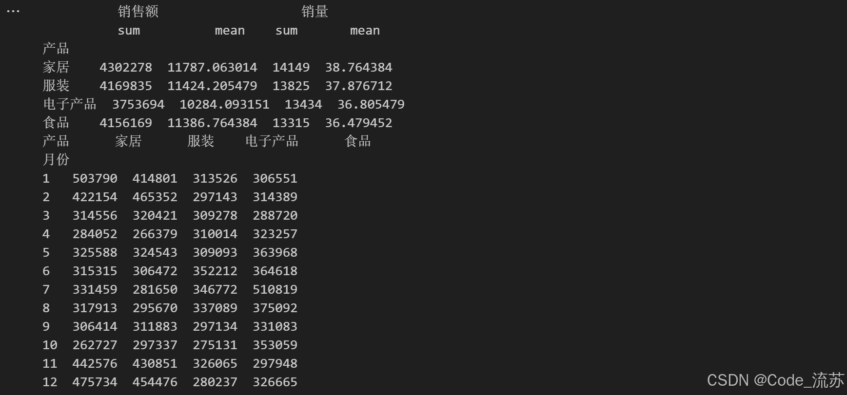 # 按月份和产品分组,计算每月每种产品的总销售额