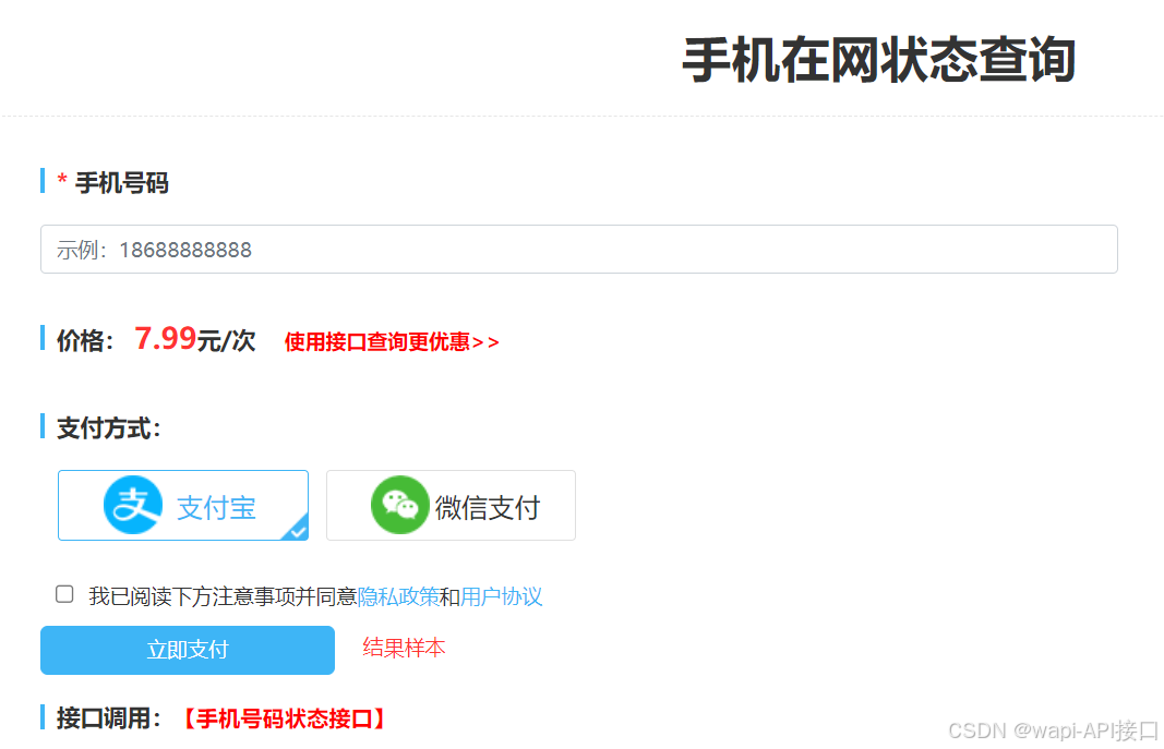 假设我们想要查询一个手机号的在线状态,我们可以通过调用这个API接口来实现。下面是一个简单的示例代码,用于查询手机号码"13800138000"的在线状态: