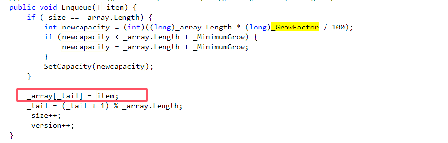 当数组元素已满时,队列中的数组会按比例将当前容量扩容,通过设置一个_MinimumGrow值,确保扩容幅度不低于最小增量,防止频繁扩容。