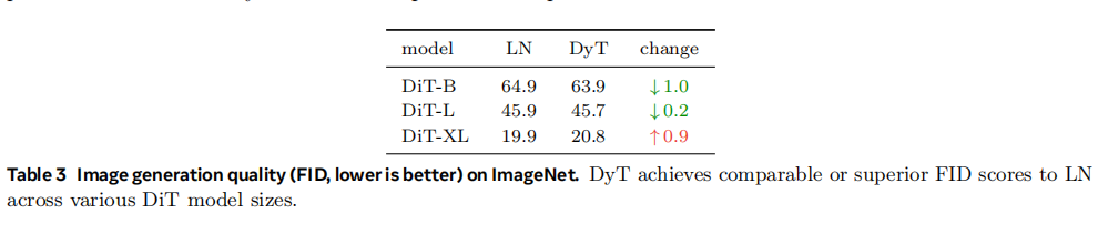 扩散模型 我们在ImageNet-1K(Deng et al.,2009)上训练了三个Diffusion Transformer(DiT)模型(Peebles和Xie,2023),它们的大小分别为B、L和XL,补丁大小分别为4、4和2。请注意,在DiT中,LN层的仿射参数用于DiT中的类别调节,我们在DyT实验中保持这种方式,只是用tanh(αx)函数替换归一化变换。训练后,我们使用标准ImageNet"参考批次"评估Frechet Inception Distance(FID)分数,如表3所示。DyT的FID与LN相当或有所提高。