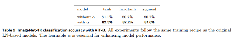 替换和删除tanh 我们用其他挤压函数,特别是hardtanh和sigmoid(图7)替换了DyT层中的tanh,同时保持可学习缩放器α不变。此外,我们评估了完全移除tanh的影响,即用恒等函数替换tanh,同时仍保留α。如表8所示,挤压函数对于稳定的训练至关重要。使用恒等函数会导致训练不稳定和发散 ,而挤压函数则能实现稳定的训练。在各种挤压函数中,tanh表现最佳。这可能是因为它具有平滑性和零中心特性。