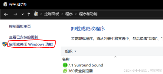 - 控制面板 → \to → 程序 → \to → 程序和功能 → \to → 启用或关闭 Windows 功能