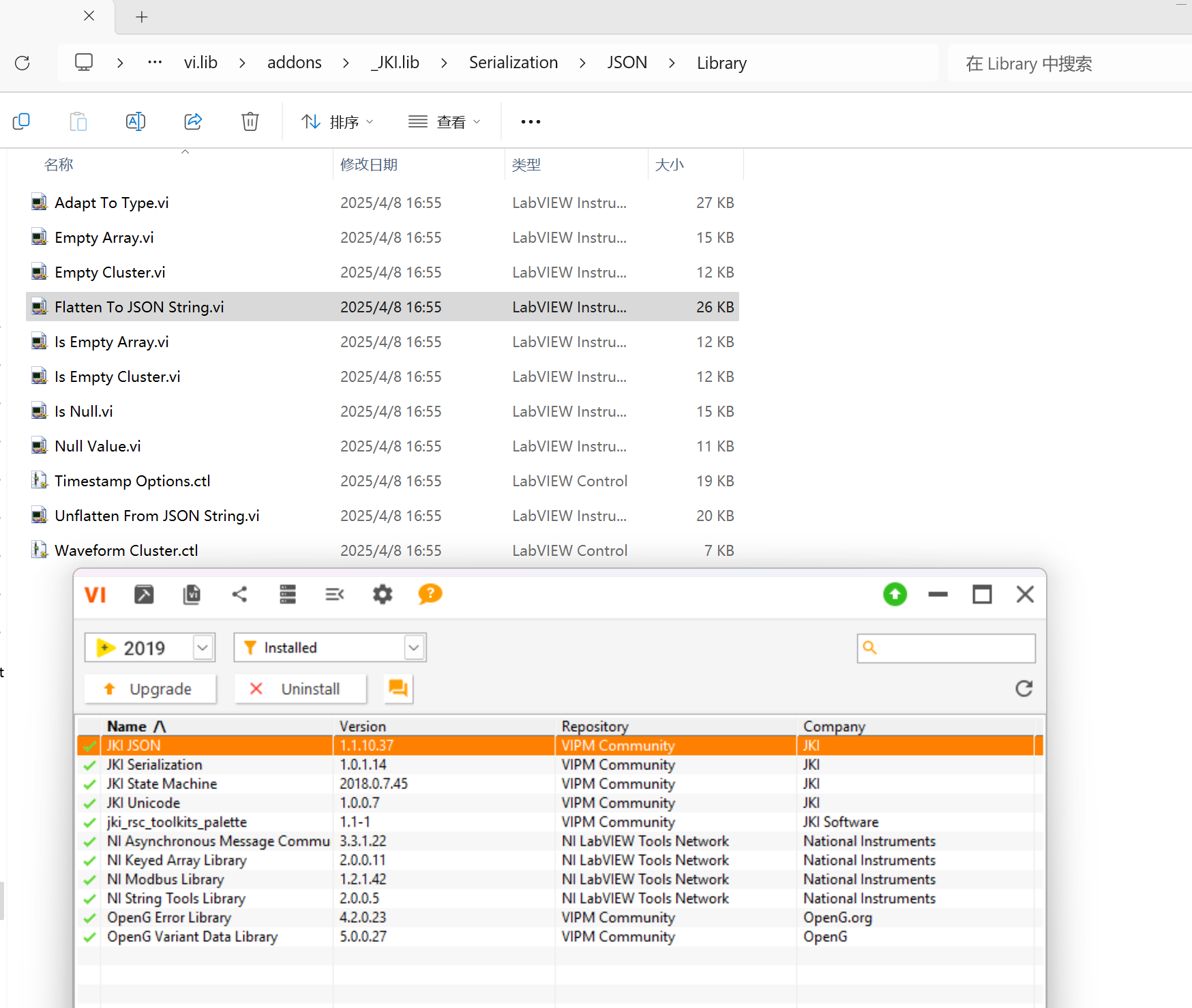 在搜索结果中找到 JKI JSON 相关的包,选中后点击 "安装" 按钮。VIPM 会自动下载并安装该库到你的 LabVIEW 环境中。安装完成后,重启 LabVIEW ,就能在函数选板中找到包含 "Flatten To Json String" VI 的 JKI JSON 库。