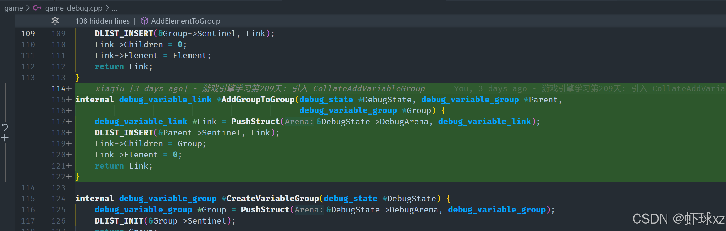 我们现在开始重新梳理向组中添加变量(现在更准确地说是元素)的逻辑。之前的实现中,是将事件加入某个组中,而现在的模型更接近于添加"元素",这些元素可以是变量或其他调试信息。我们将原有的"添加变量到组"的函数,逐步改造为"添加元素到组",传入的元素就是我们真正希望处理和存储的内容。基本逻辑和之前类似,不需要做太大改动。