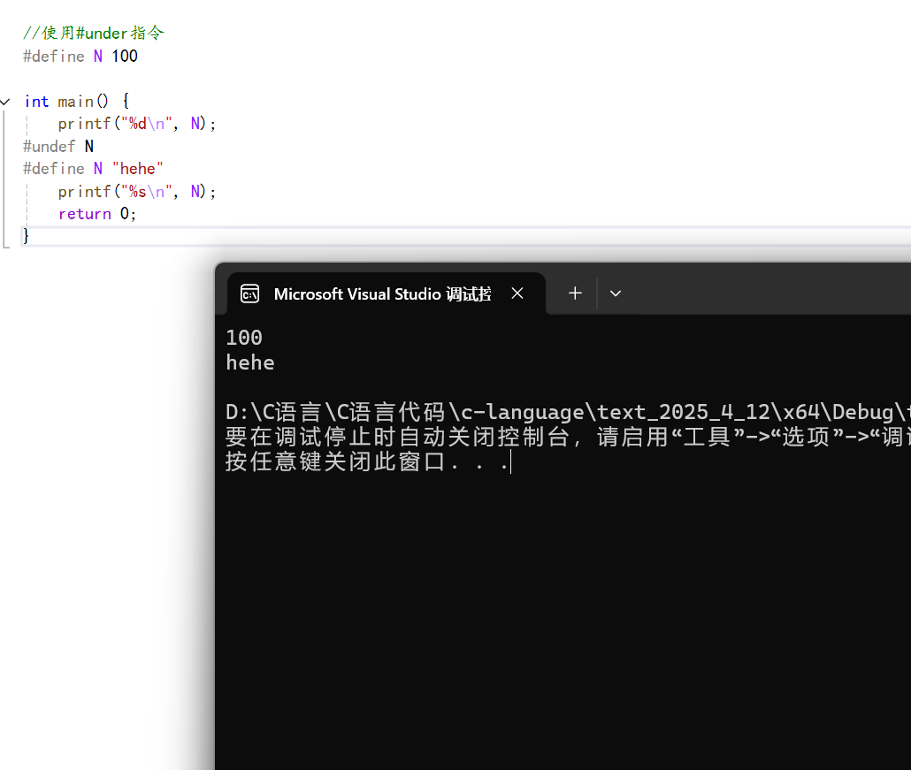 上面我们首先使用#define将N定义为100,然后将其在屏幕上打印,然后我们使用#undef先将其原来的定义移除,然后再将N重新定义为hehe字符串,然后将其在屏幕上打印。