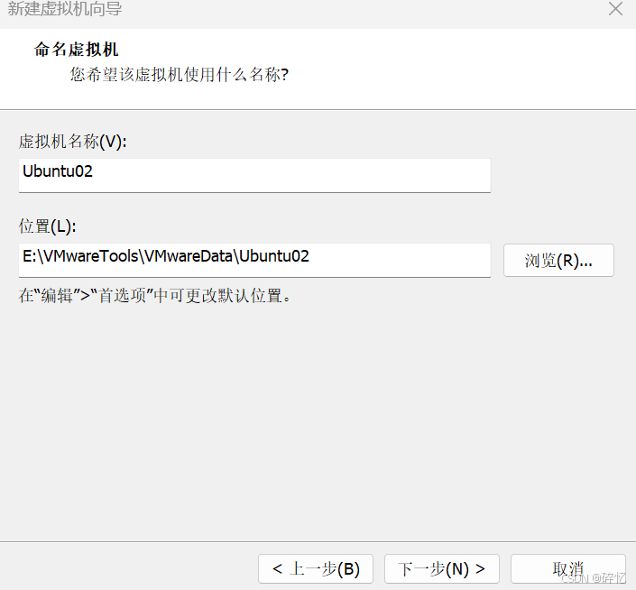 5、在弹出的页面中,设置"虚拟机名称"为"Ubuntu02",并设置虚拟机文件保存位置。然后点击"下一步"。