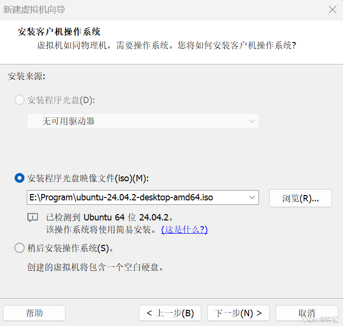 3、在出现的页面中,选中"安装程序光盘映像文件(iso)(M)",点击"浏览"按钮, 在弹出的页面中,找到之前已经准备好的Ubuntu安装映像文件ubuntu-24.04.2-desktop-amd64.iso,我这里放在了E盘。选好之后点击下一步。