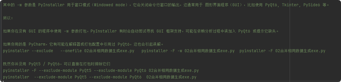 如果你在没有 GUI 的程序中使用 -w 参数打包,PyInstaller 有时会自动尝试寻找 GUI 框架支持,可能在依赖分析过程中误加入 PyQt6 或提示它缺失。