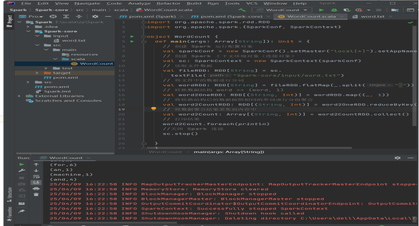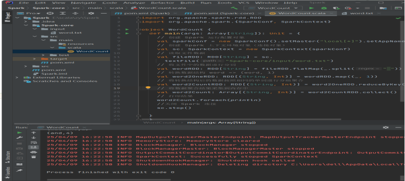 在Spark-core中创建名为input的文件夹,在此文件夹中创建word.txt文件,并在文件中添加需要进行统计的语句。