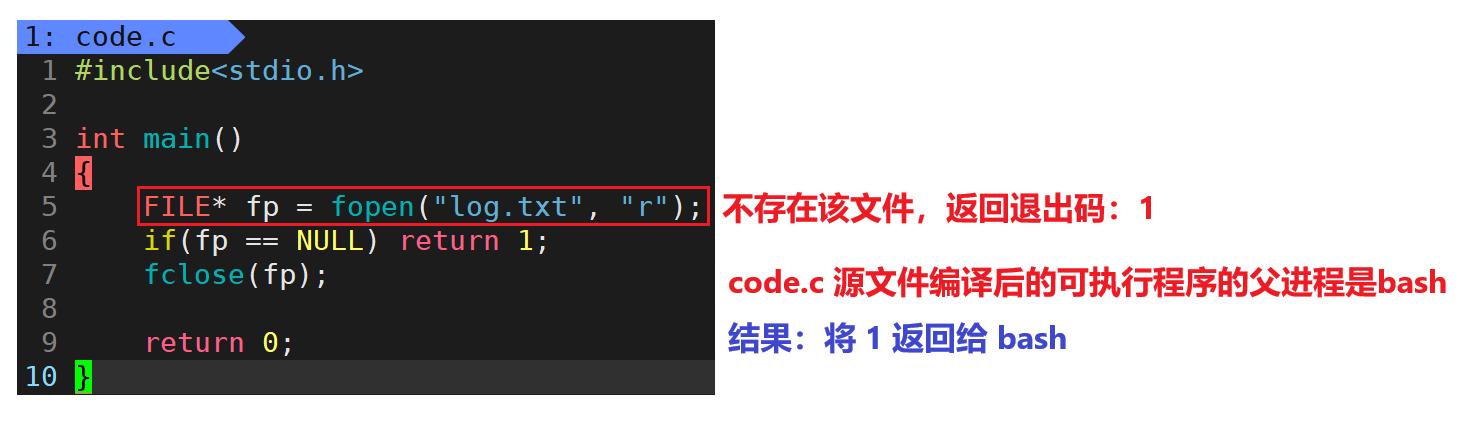 - 任何地方调用exit,表示进程结束,将函数中的退出码返回给父进程。