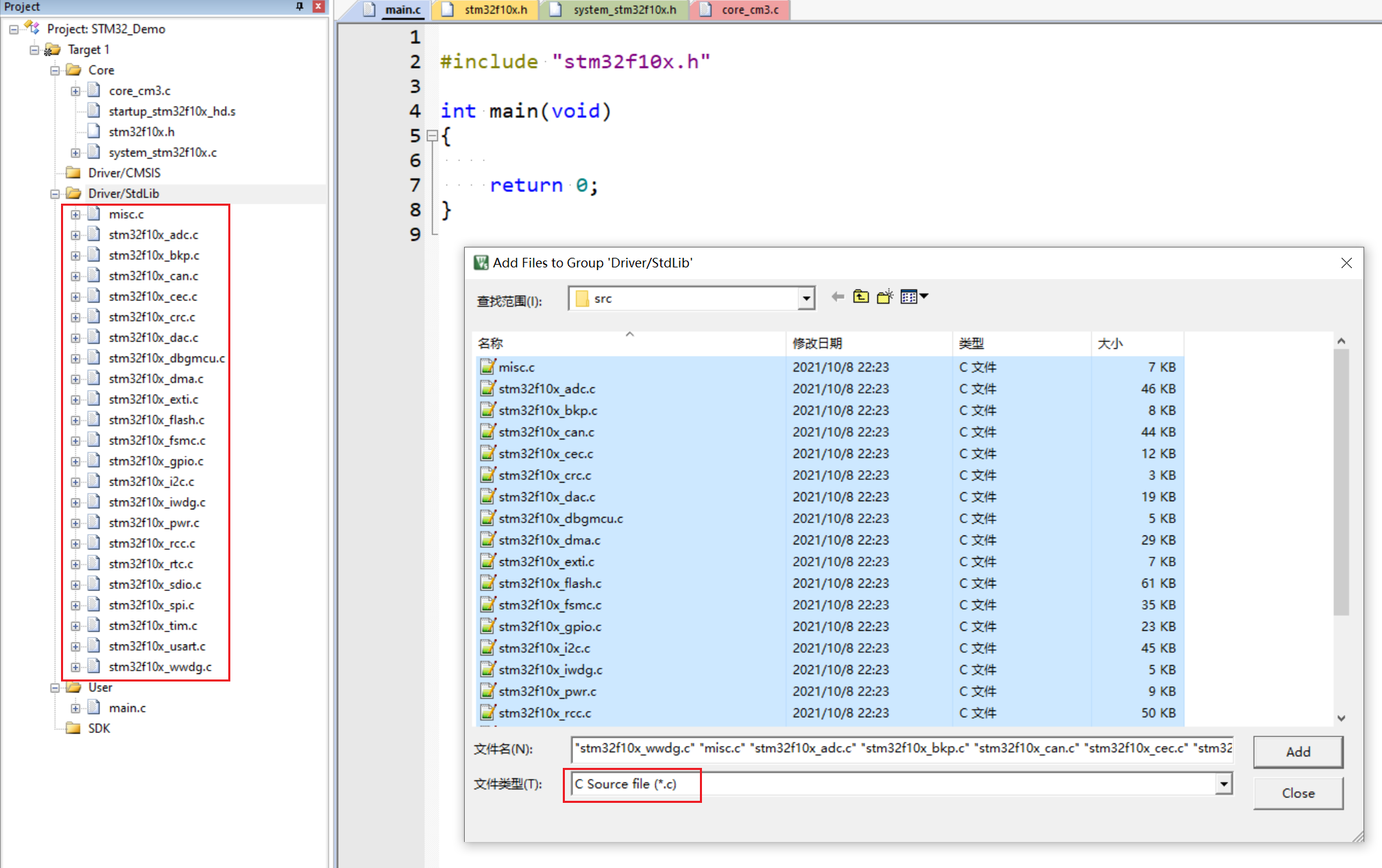 将 标准库源文件添加到 Driver/StdLib Group。注意:下图文件类型要选择 C Source file(*.c)。
