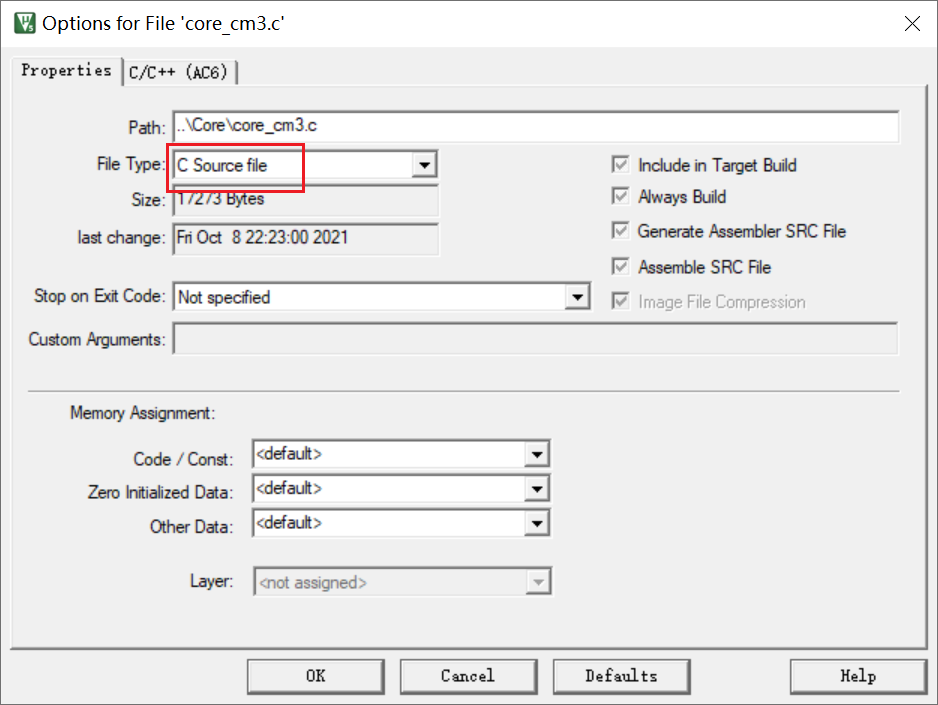 注意:.h 文件添加到分组后不能设置为 "C Source File" 类型,可以设置为 "Text Document file" ,或者直接不要把 .h 文件添加到分组中,否则编译报错