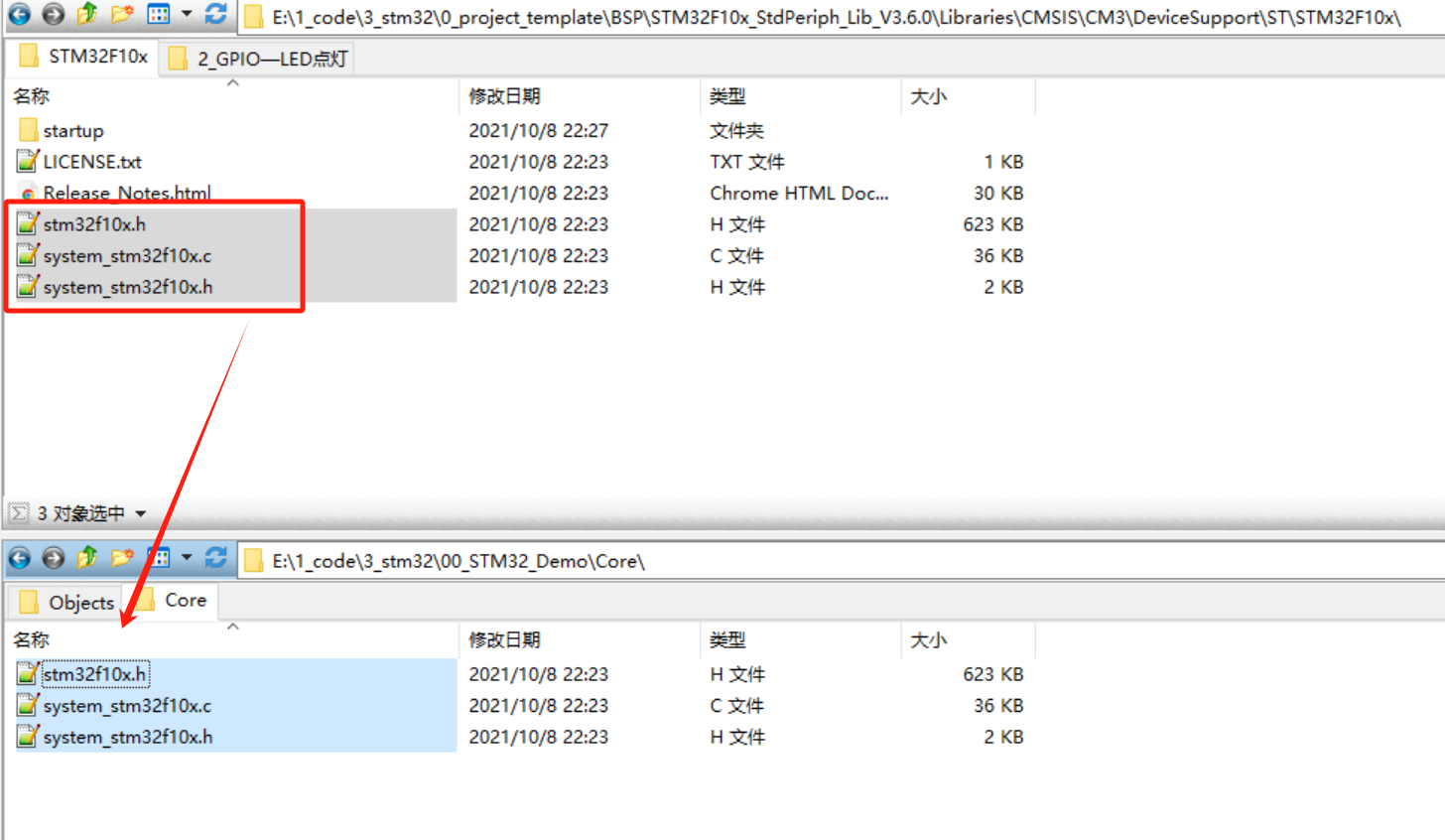 将 STM32F10x_StdPeriph_Lib_V3.6.0\Libraries\CMSIS\CM3\CoreSupport\ 目录下的 {core_cm3.c, core_cm3.h} 拷贝到 00_STM32_Demo\Core 目录下。