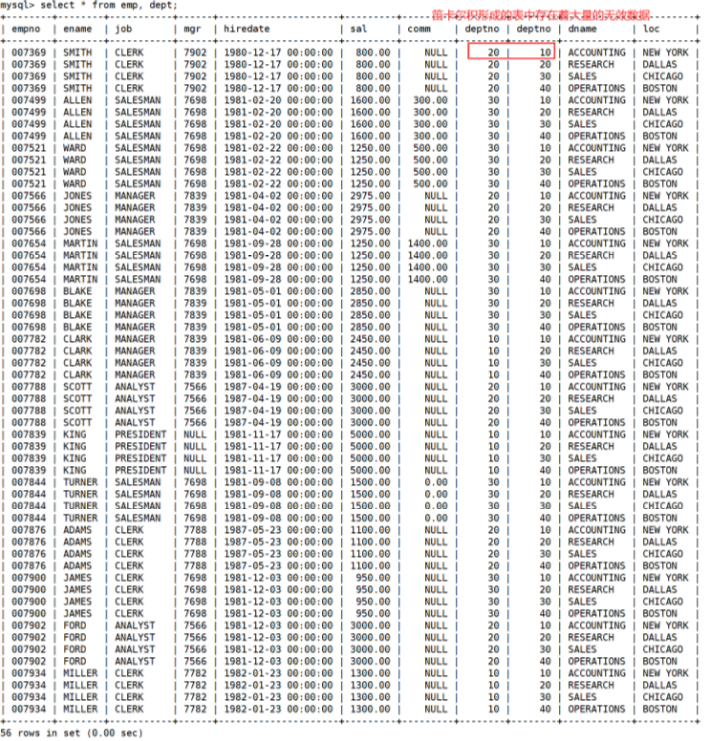 mysql> select dept.deptno, dname, loc, ename, sal from dept, (select emp.ename, emp.sal, emp.deptno from emp,