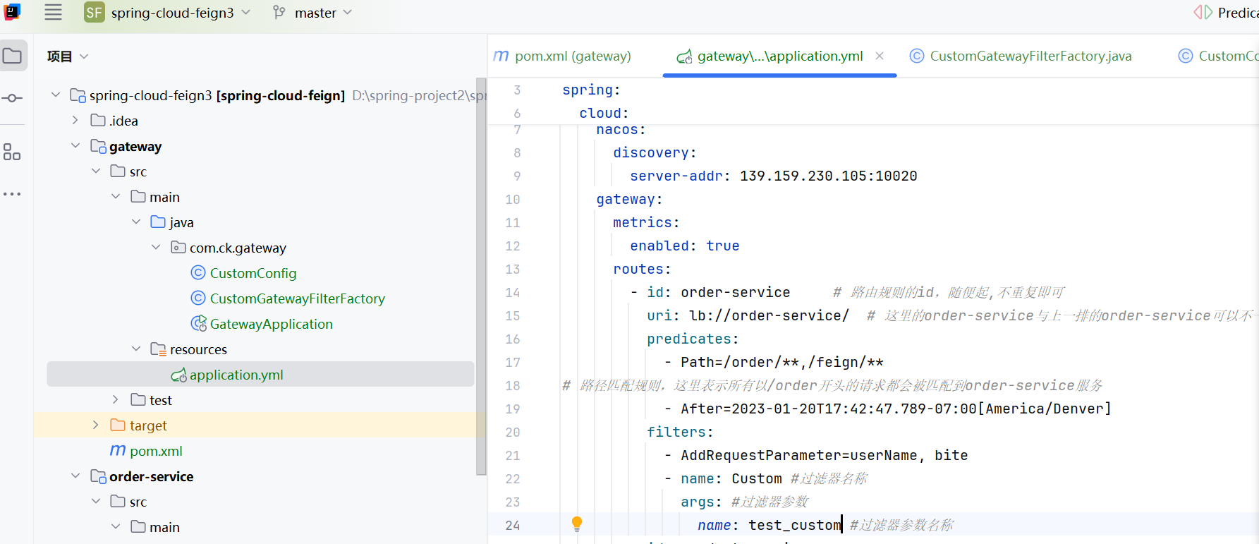 GatewayFilter 同Predicate 类似,都是在配置⽂件application.yml 中配置,每个过滤器的逻辑都是固定的.⽐如AddRequestParameterGatewayFilterFactory 只需要在配置⽂件中写AddRequestParameter ,就可以为所有的请求添加⼀个参数,我们先通过⼀个例⼦来演⽰GatewayFilter如何使⽤.