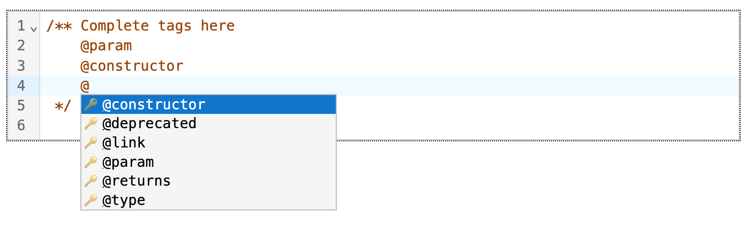 您现在可以使用这样的扩展来为JavaScript内容启用此完成源,会显示 JSDoc 关键词的自动补全提示。