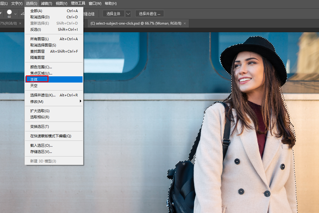 在PhotoShop中的选择工具中也提供了快捷选择主体的功能,可以一键划分主体的选区。