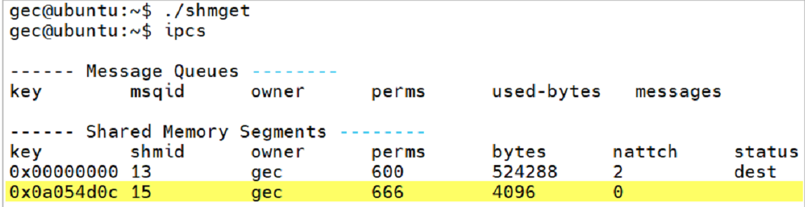 练习:根据函数的使用规则,在系统中创建一块共享内存,创建完成后,要求在程序中执行指令 ipc -s 来查看当前系统中IPC对象的资源情况。