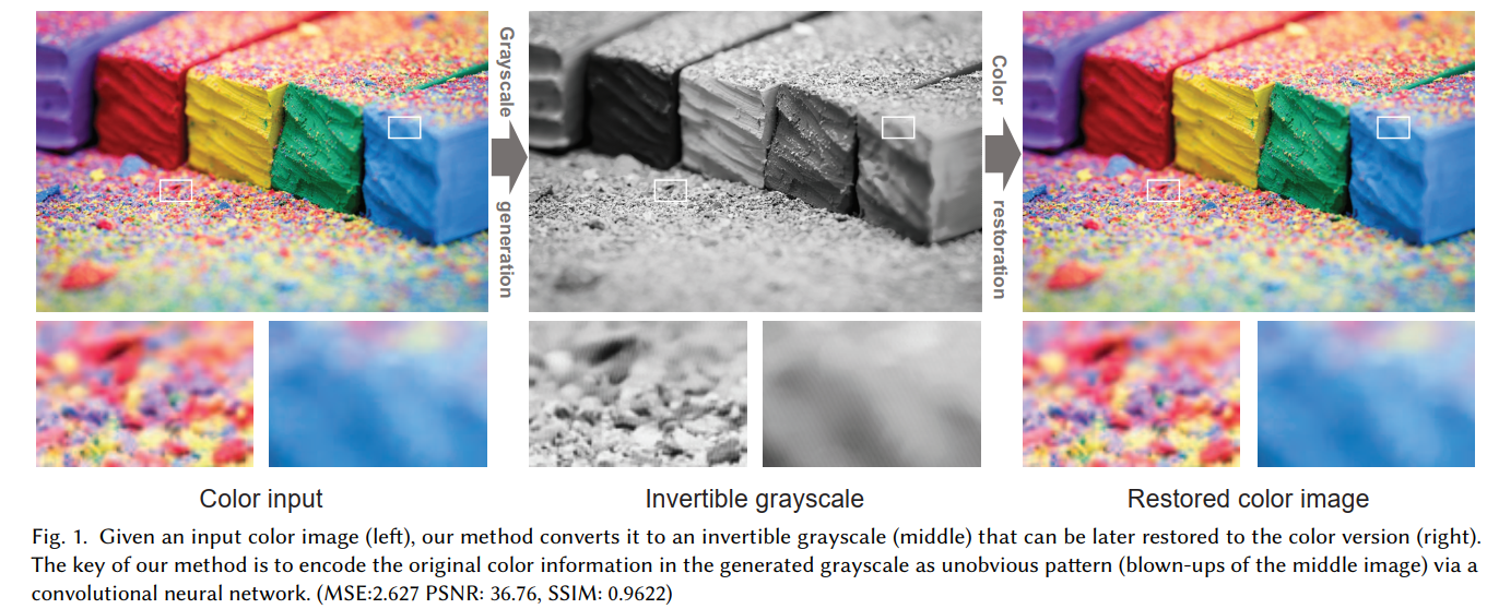 在本文中,我们提出了一种创新方法,可将彩色图像转换为灰度图像,并且之后该灰度图像能够被还原回其彩色版本。我们将其称为可逆灰度图像。图 1 展示了由彩色输入图像(左侧)生成的可逆灰度图像(中间),而右侧的图像则是还原后的彩色图像。这里的关键思路是将原始颜色信息编码到生成的灰度图像中,以便在后续的颜色还原过程中能够恢复所编码的颜色信息。图 1 底行放大后的灰度子图像揭示了颜色是如何被编码成不明显的图案的。然而,由于输入内容的多样性是无边界的,手动设计这样一种颜色编码方案极其复杂。