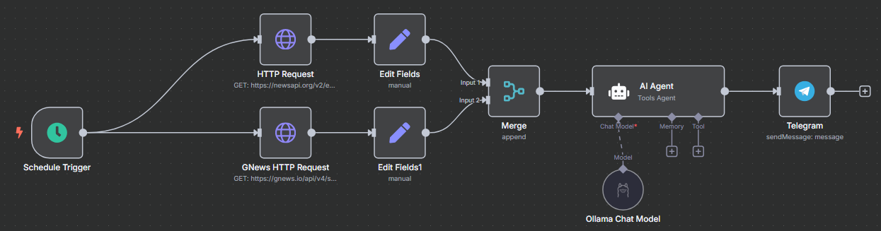 该工作流,计划每天早上8点,定时自动抓取国外的 AI 相关的新闻,经过 AI 翻译整理后,自动发送到我指定的 Telegram 频道当中,总体的工作流如下图所示